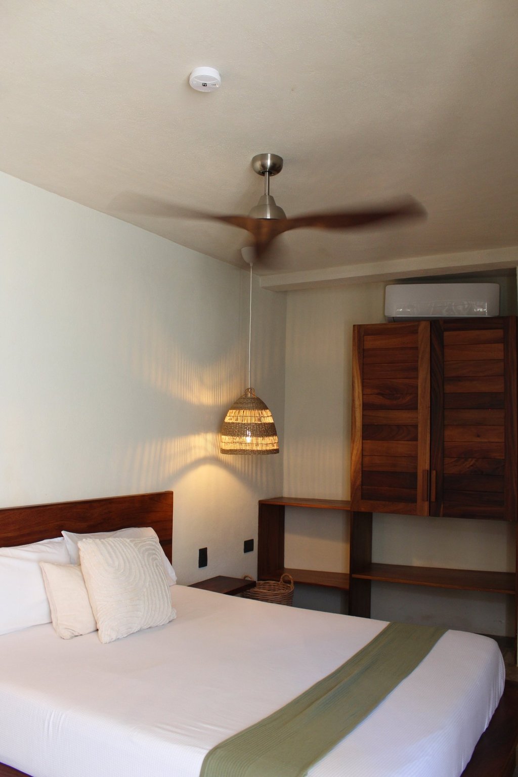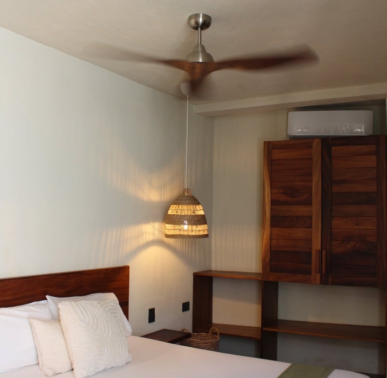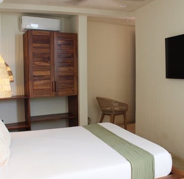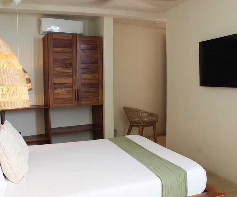 Cálida y funcional, equipada con cama Queen, pequeña barra, Wi-Fi, TV, aire acondicionado y baño privado. Ideal para descansar con comodidad.